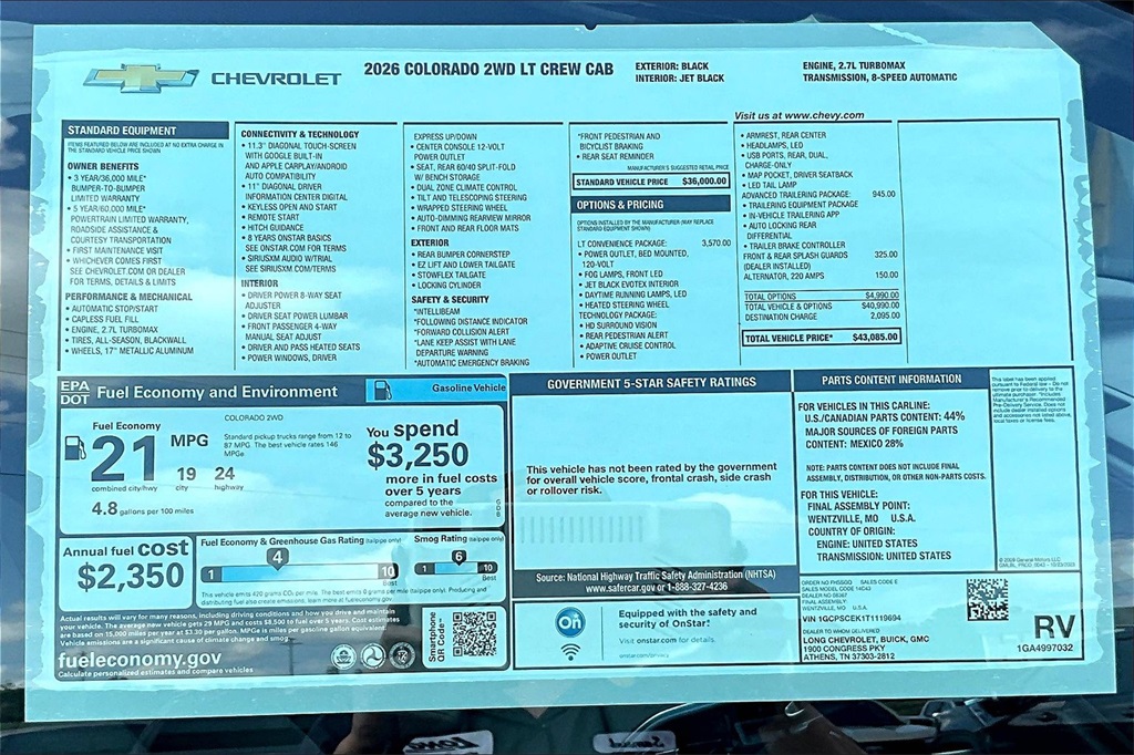 Black 2026 Chevrolet Colorado LT RWD 8-Speed Automatic 2.7L I4 Turbocharged DOHC 16V LEV3-ULEV50 310hp Price includes: $1000 - Chevrolet Consumer Cash Program. Exp. 02/02/2026
