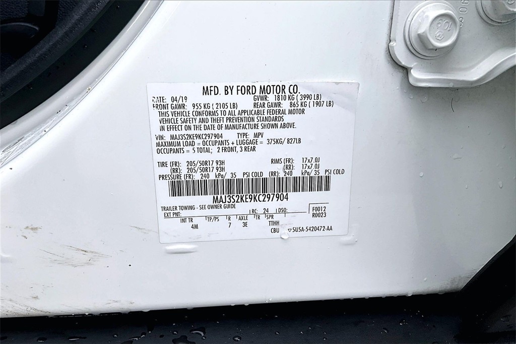 VIN: MAJ3S2KE9KC297904 | Stock #: 297904P | Mileage: 48,014