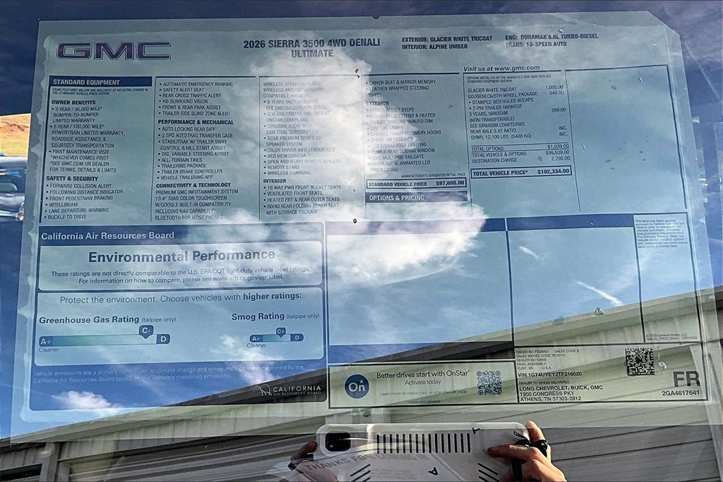 Glacier White Tricoat 2026 GMC Sierra 3500HD Denali Ultimate 4WD 10-Speed Automatic Duramax 6.6L V8 Turbodiesel 10-Speed Automatic 4WD Alpine Umber Leather. Price includes: $500 - Buick & GMC Consumer Cash Program. Exp. 03/31/2026